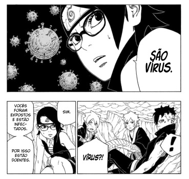 Para entender melhor o que é essa névoa escura de Boro, Mitsuki tem uma ideia. Lembram do último ataque de Mitsuki no capítulo anterior? Ele conseguiu prender um pouco de névoa com a cobra. Então, o garoto pede à Sarada que use o seu Sharingan para conseguir visualizar sua verdadeira natureza. Eis que sarada revela para nós o segredo. Vírus. O que estava presente na névoa eram vírus. E como ninjutsus não podem produzir vírus de verdade, a equipe suspeita de que seu inimigo usa uma "ferramenta científica ninja".
