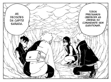 SARADA COMO LÍDER - No capítulo anterior, Sarada salva os garotos durante a luta contra Boro. Ao arremessar uma pedra, o vilão é soterrado. Isso não o matou, mas funcionou como distração, dando tempo para recuar. Por causa da sua atitude em campo, o novo time sete a escolheu como líder neste capítulo.