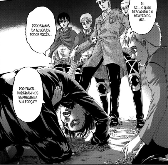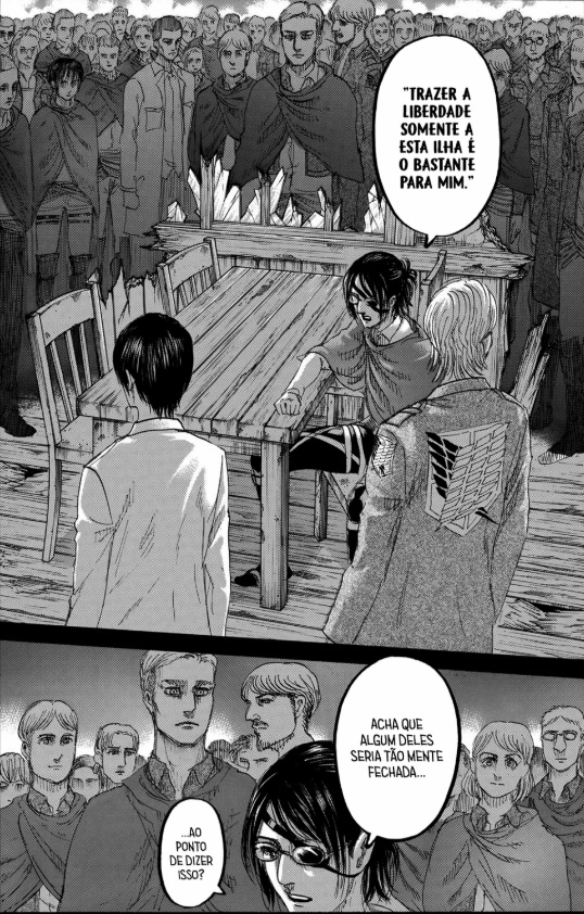 Essa frase faz todos eles refletirem sobre algo. Se tivessem conversado antes, não estariam lutando e matando uns aos outros agora. E apesar de parecer uma coisa (boba)(principalmente agora que o Eren se transformou em titã e pretende esmagar os cidadão de Marley) esse ato é o que o grupo pretende fazer. Através do diálogo, eles vão convencer o mundo de que podem viver em harmonia uns com os outros. Hanji é quem mais parece acreditar nisso.