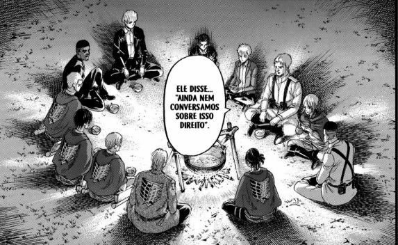 E então chegamos na cena da reunião do grupo. Agora que todos estão reunidos na floresta, eles precisam conversar mais sobre detalhes do plano. Mas o que acontece é uma enxurrada de provocações e discussões sobre o passado. Como eu disse no capítulo anterior, o grupo encontraria problemas para se relacionar. Afinal, estamos falando de marleynianos e eldianos tentando trabalhar juntos. Dois povos que brigam a séculos não poderiam começar essa reunião sem terem uma briguinha.
